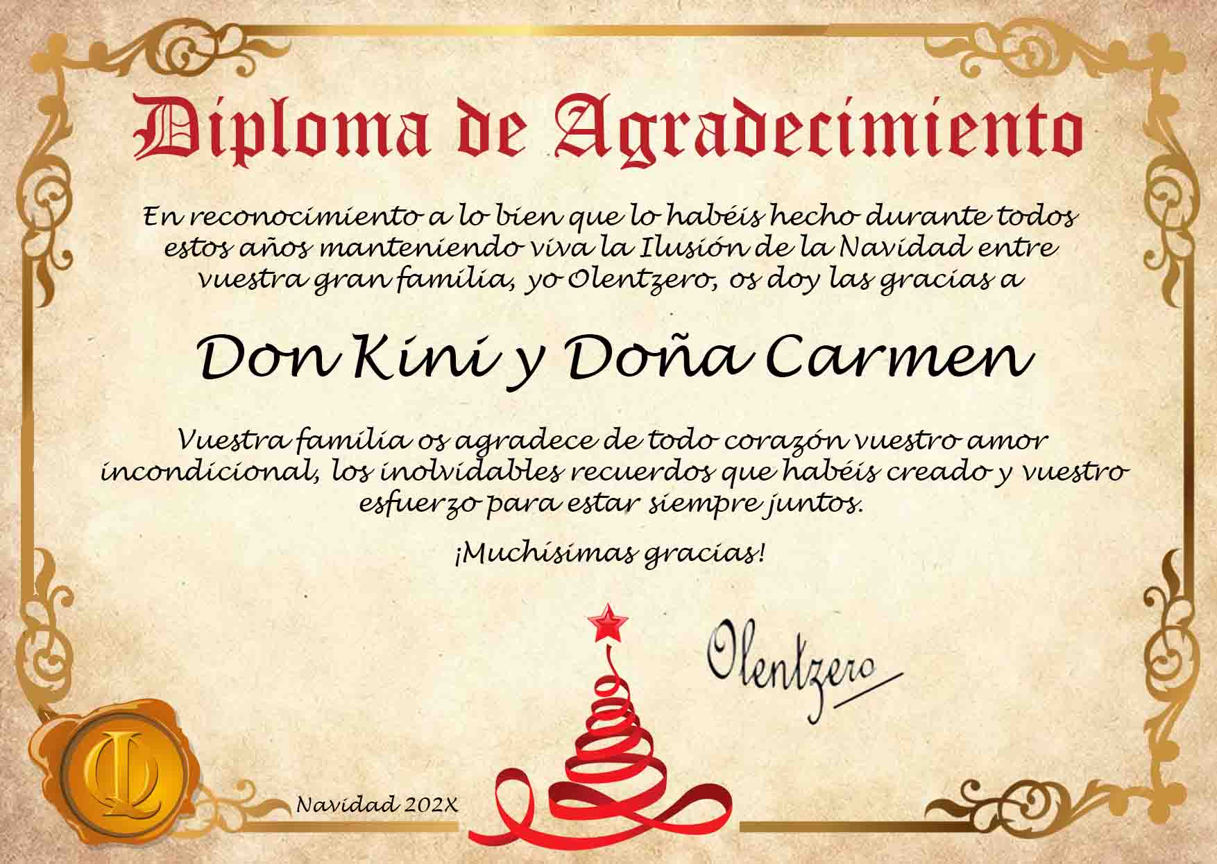- Un Diploma personalizado donde Olentzero agradece a nuestros seres queridos el haber mantenido viva la magia de la Navidad durante tanos años. Y en el que podréis firmar toda la familia.